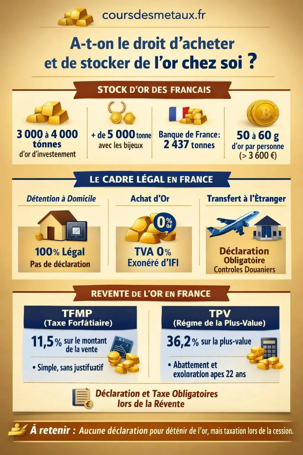 La question ne se résume donc pas à « a-t-on le droit ? », mais plutôt à : dans quel cadre juridique acheter, conserver, déplacer et revendre son or pour rester en conformité fiscale et limiter les risques (vol, saisie, litige familial, contestation d’héritage).